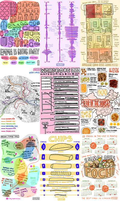 Dear friends, I thought I’d already sent this email, but I think I just… thought about sending it. (Sorry if I am doubling up though?!) So hello, and happy March, month of Emma’s birth :) (And I am sure, lots of other things). I had a particularly fun and productive February, in terms of… well, the types of things I email you all about. Firstly, it was hourly comics day — my 13th year participating! You can see my hourlies here: https://emmacharleston.blogspot.com/2026/02/hourly-comics-day-2026.html Secondly, an entirely made up thing which I decided to do this year: ‘Data vis February’, in which every single one of my visual diaries this month was a data visualisation. You can read more about that (and see the diaries) here: https://emmacharleston.blogspot.com/2026/02/february-2026-aka-data-vis-feb.h... [February2026.jpg] I hope you enjoy these. They were a lot of fun to make (though I am glad to just go back to drawing whatever I want now, and not having to think of every day through the lens of data). Hope you’re enjoying the same decidedly more spring-like weather we’re experiencing here in London wherever you are! [signature.jpg]